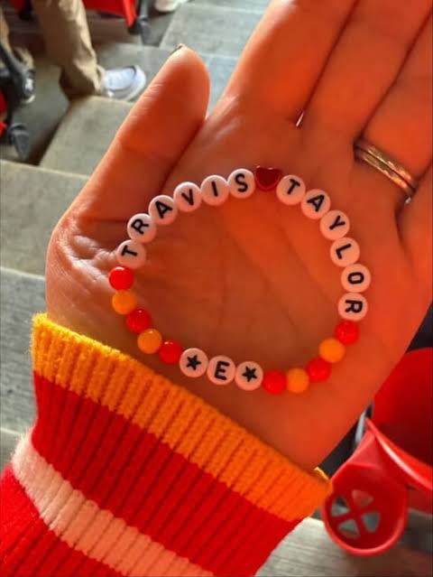 The bracelets spell out “Travis” and “Taylor” connected by a single heart bead, and featured the letter “E” at the bottom, likely as a sort of signature for Ed’s first name.