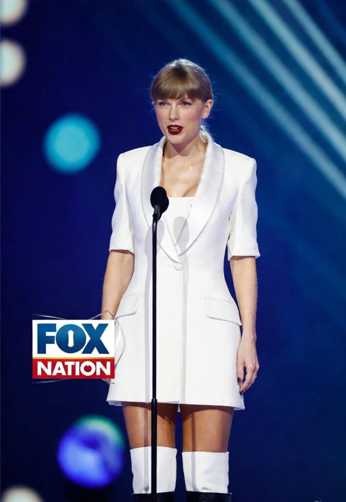 The atmosphere at the Fox Nation 2025 Patriot Awards was charged with elegance, pride, and quiet anticipation. Cameras flashed from every corner as the crowd waited to see who would walk away with the highly coveted Patriot of the Year award. When Taylor Swift stepped onto the red carpet, dressed in a stunning white tailored short-sleeve suit layered over a matching mini dress and fitted trousers, paired with sleek black high-knee boots, the room nearly froze for a moment. Her sleek ponytail and bold red lipstick completed the look — a blend of grace, power, and undeniable confidence. She looked every bit like a woman ready to claim something historic.